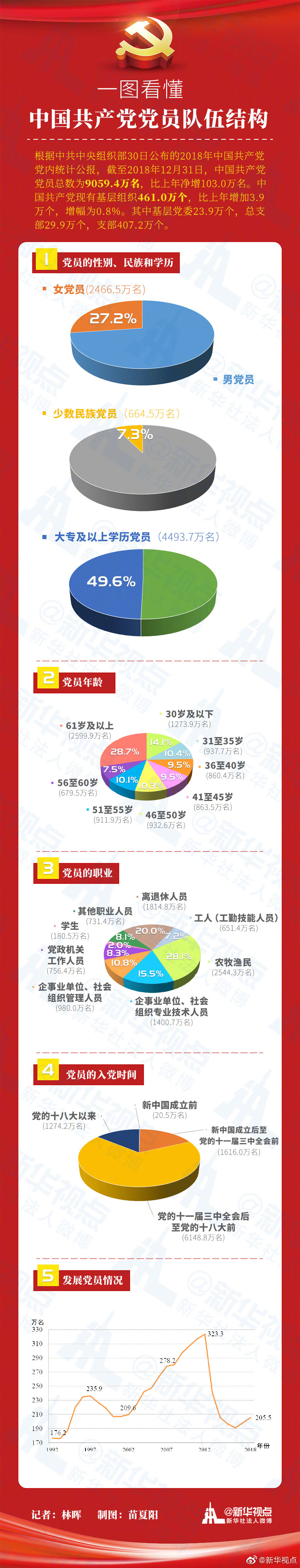 截至2018年12月31日,中國共產黨黨員總數為9059.4萬名,比上年凈增103.0萬名。