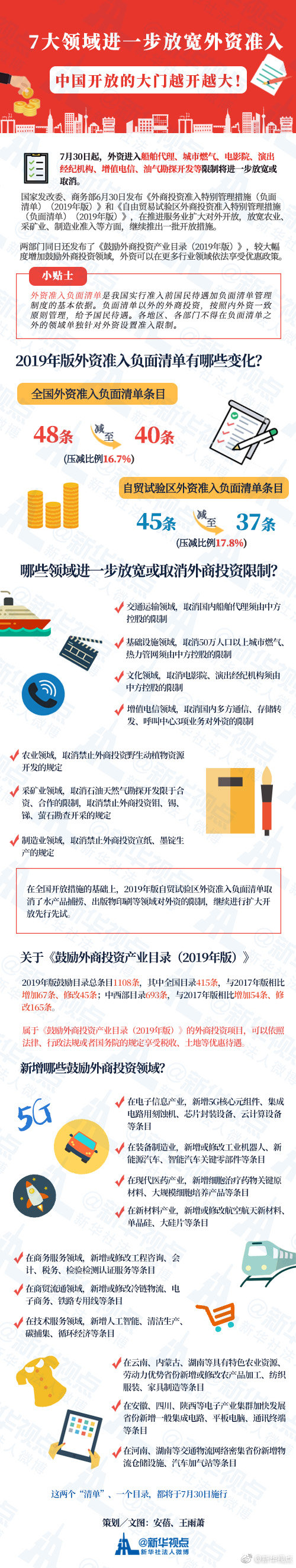 7月30日起,外資進入船舶代理、城市燃氣、電影院、演出經(jīng)紀機構(gòu)、增值電信、油氣勘探開發(fā)等限制將進一步放寬或取消。國家發(fā)改委、商務(wù)部6月30日發(fā)布《外商投資準入特別管理措施(負面清單)(2019年版)》,清單條目由48條減至40條。同日發(fā)布的《自由貿(mào)易試驗區(qū)外商投資準入特別管理措施(負面清單)(2019年版)》條目由45條減至37條。(記者安蓓、王雨蕭)?