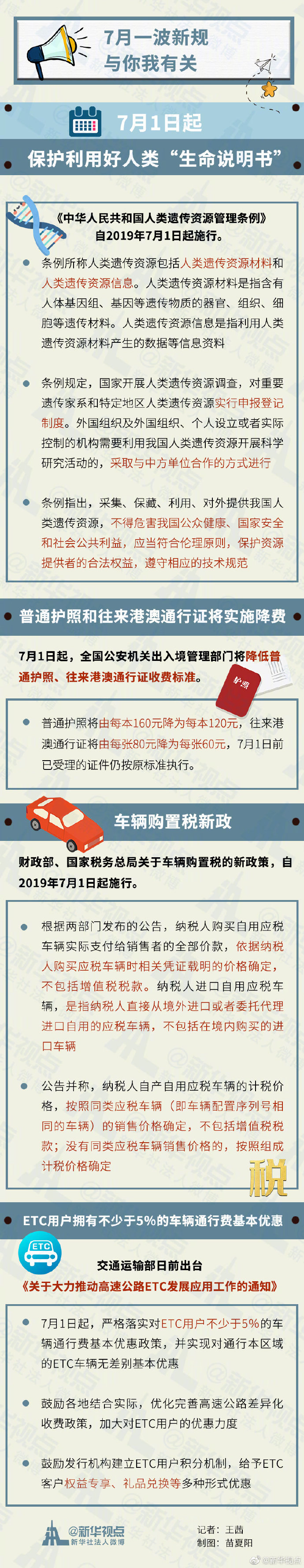 保護利用好人類“生命說明書”;普通護照和往來港澳通行證將實施降費;車輛購置稅新政7月1日起施行;ETC用戶擁有不少于5%的車輛通行費基本優惠……7月1日起,一批與你我有關的新規將正式施行。戳圖帶你了解干貨??,轉發周知! ????
