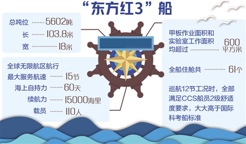 “東方紅3”船是一艘5000噸級新型深遠(yuǎn)海綜合科學(xué)考察船,以培養(yǎng)深海大洋創(chuàng)新型人才為首要任務(wù),融合科學(xué)研究、科學(xué)考察、高新技術(shù)研發(fā)應(yīng)用為一體。該船總長103.8米、寬18米,海上自持力長達(dá)60天,可連續(xù)航行1.5萬海里;載員110人,甲板作業(yè)面積和實驗室工作面積均超過600平方米。該船是目前世界上最安靜,定員最多,經(jīng)濟(jì)性、振動噪聲、電磁兼容等指標(biāo)要求最高,作業(yè)甲板和實驗室面積利用率最大、綜合科考功能最完備的新一代海洋綜合科考船。