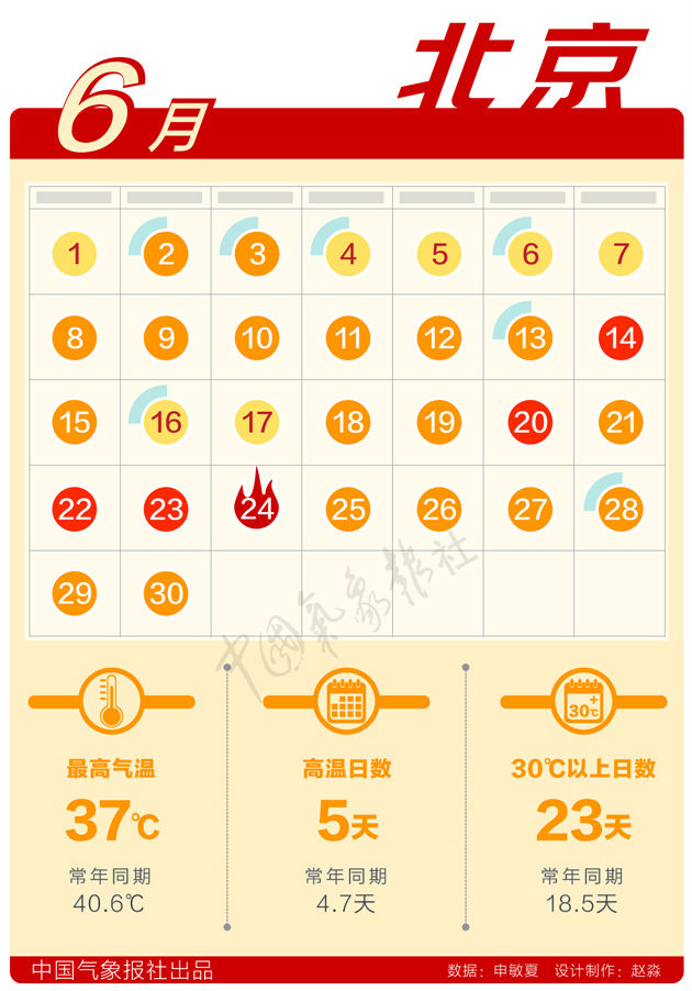 北京:2019年6月,北京南郊觀象臺觀測到高溫日數為5天,與常年4.7天差不多。最高氣溫37℃,尚未突破歷史極值40.6℃,但超過30℃的天數23天,比同期18.5天偏多,且6月22日到6月24日連續3天出現高溫日數。