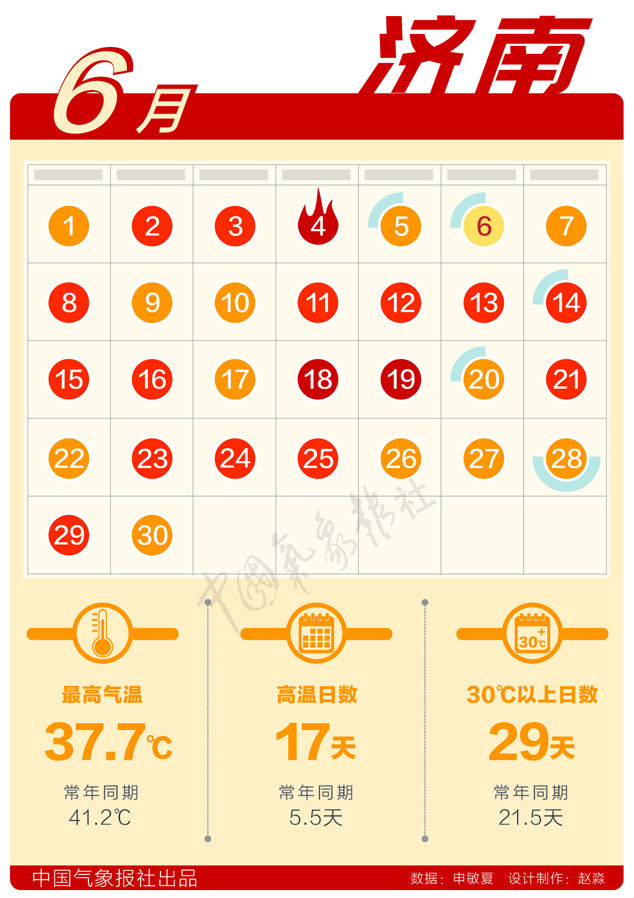 濟南:6月,濟南市區共出現17個高溫日,位列歷史同期第二位,第一位是1955年22個高溫日。最高氣溫37.7℃,與有記錄以來濟南市區6月最高氣溫41.2(2009年6月25日)還差一點。6月35℃以上高溫日數也未突破歷史極值,但30天中有29天都是30℃以上。