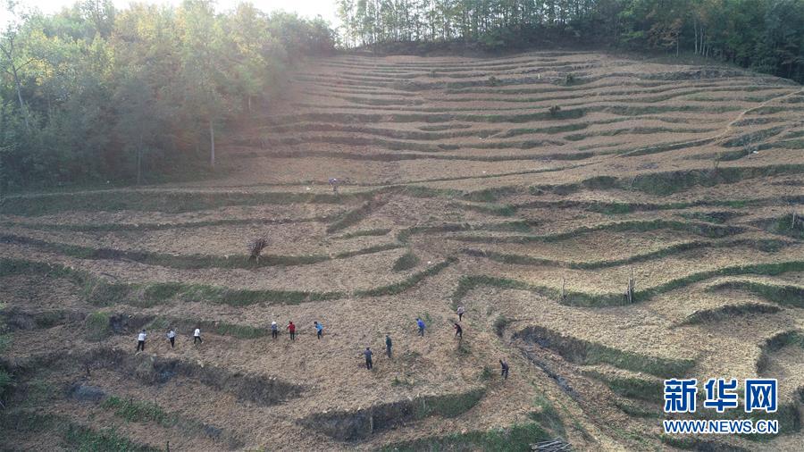 在四川省青川縣青坪村,當地村民在種植白茶(2018年10月29日無人機拍攝)。新華社記者 王天聰 攝