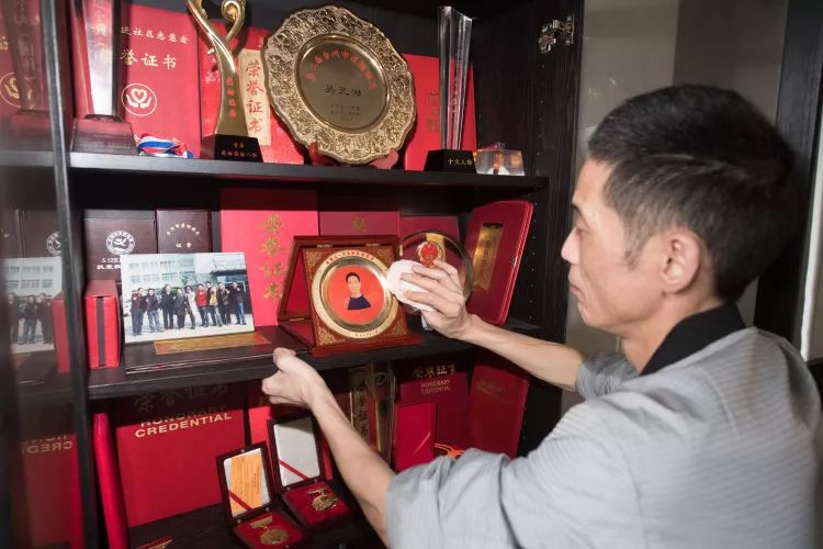 吳元渺在擦拭自己的全國(guó)五一勞動(dòng)獎(jiǎng)?wù)隆9褡永飻[放的都是他獲得的各種榮譽(yù)證書(shū)和獎(jiǎng)?wù)隆?/font>