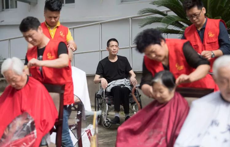 吳元渺愛(ài)心服務(wù)隊(duì)的志愿者們?cè)谂R海市一家養(yǎng)老院為老人義務(wù)理發(fā)。吳元渺坐在一個(gè)角落靜靜地看著他們。