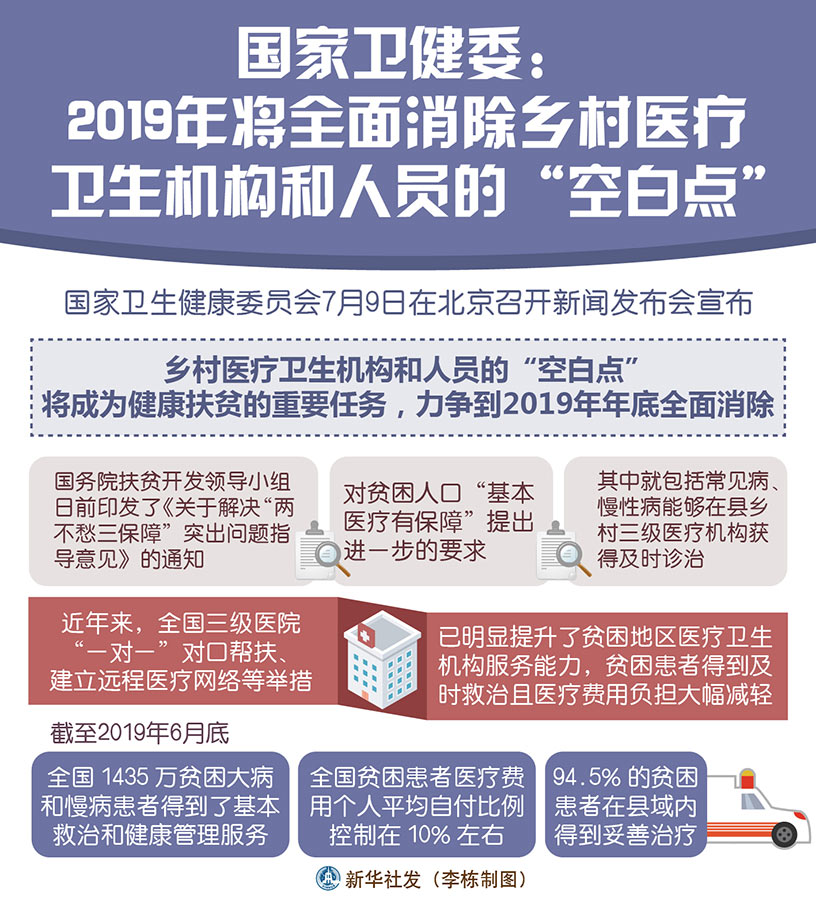 新華社北京7月9日電(記者屈婷、王秉陽)少數(shù)地區(qū)仍有衛(wèi)生室“空白村”,“三區(qū)三州”深度貧困地區(qū)有的鄉(xiāng)鎮(zhèn)缺少全科醫(yī)生……國家衛(wèi)生健康委員會9日在京召開新聞發(fā)布會宣布,像上述這些鄉(xiāng)村醫(yī)療衛(wèi)生機(jī)構(gòu)和人員的“空白點(diǎn)”,將成為健康扶貧的重要任務(wù),力爭到今年年底全面消除。