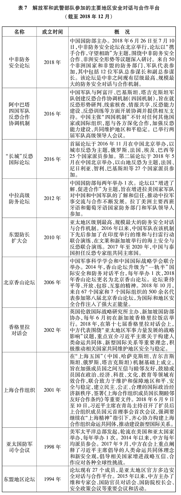 中國軍隊堅持共同、綜合、合作、可持續的安全觀,秉持正確義利觀,積極參與全球安全治理體系改革,深化雙邊和多邊安全合作,促進不同安全機制間協調包容、互補合作,營造平等互信、公平正義、共建共享的安全格局。
