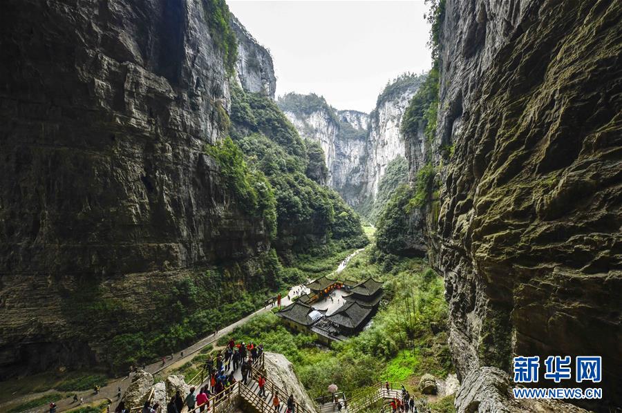 游客在重慶市武隆區的天生三橋景區游覽(2019年3月27日攝)。新華社記者 劉潺 攝