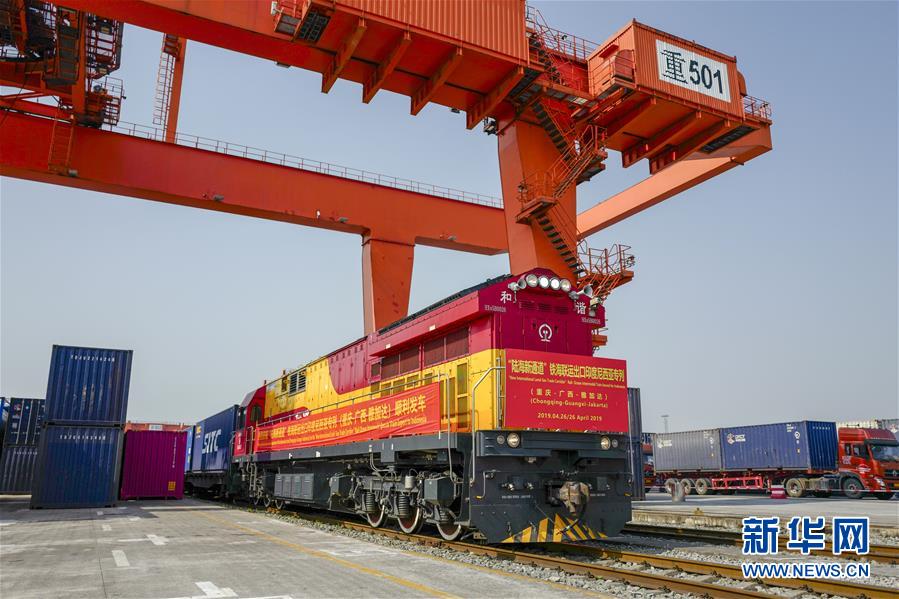 在中鐵聯集重慶中心站內,“陸海新通道”鐵海聯運出口印度尼西亞的首趟專列準備發車(2019年4月26日攝)。新華社記者 劉潺 攝