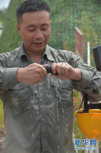 電工胡和鵬在擰被汗水浸透的發帶(7月30日攝)。新華社記者 譚元斌 攝