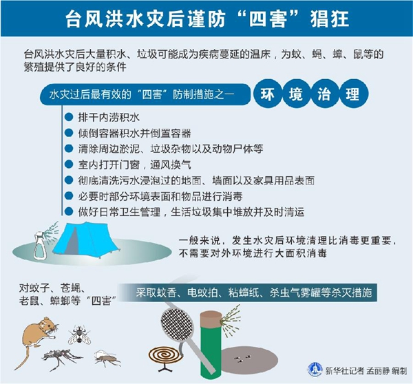新華社杭州8月11日電(記者黃筱)臺風洪水災后大量積水、垃圾可能成為疾病蔓延的溫床,為蚊、蠅、蟑、鼠等的繁殖提供了良好的條件,稍不留神這些“四害”便會猖狂。杭州市疾控中心專家提醒受災群眾需及時清理環境和消毒,預防疾病。