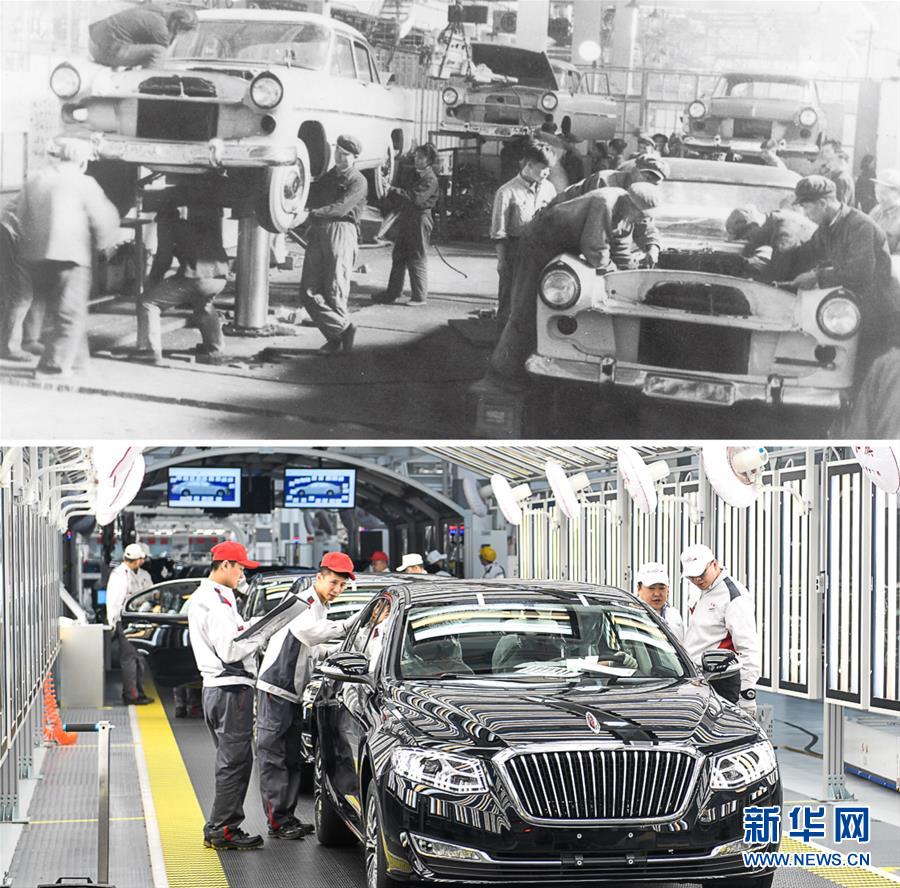 拼版照片:上圖為20世紀50年代拍攝的第一批紅旗轎車生產線(資料照片);下圖為在一汽紅旗總裝車間內,一汽紅旗職工在對生產的紅旗轎車進行靜檢作業(新華社記者許暢2019年4月9日攝)。新華社發