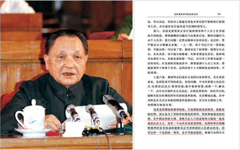 鄧小平同志高度重視堅持和加強黨的領導,旗幟鮮明地指出中國共產黨是社會主義現代化事業的領導核心,在改革開放和現代化建設中,必須始終堅持黨的領導,加強和改進黨的建設。左圖為鄧小平同志在中國共產黨第十二次全國代表大會上致開幕詞(新華社記者 錢嗣杰/攝);右圖為鄧小平同志有關堅持和加強黨的領導的重要論述。