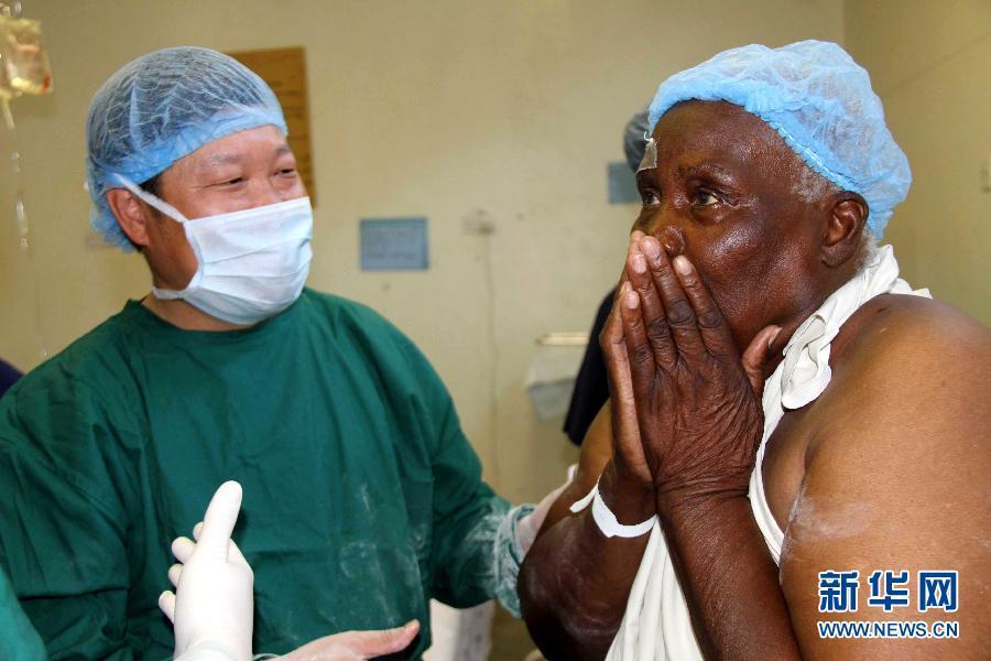 2010年11月23日,在津巴布韋首都哈拉雷郊區的奇通圭扎中心醫院,一位老人(右)在中國“非洲光明行”醫療隊為其實施復明手術后重見光明,驚喜萬分。 新華社記者 李平 攝