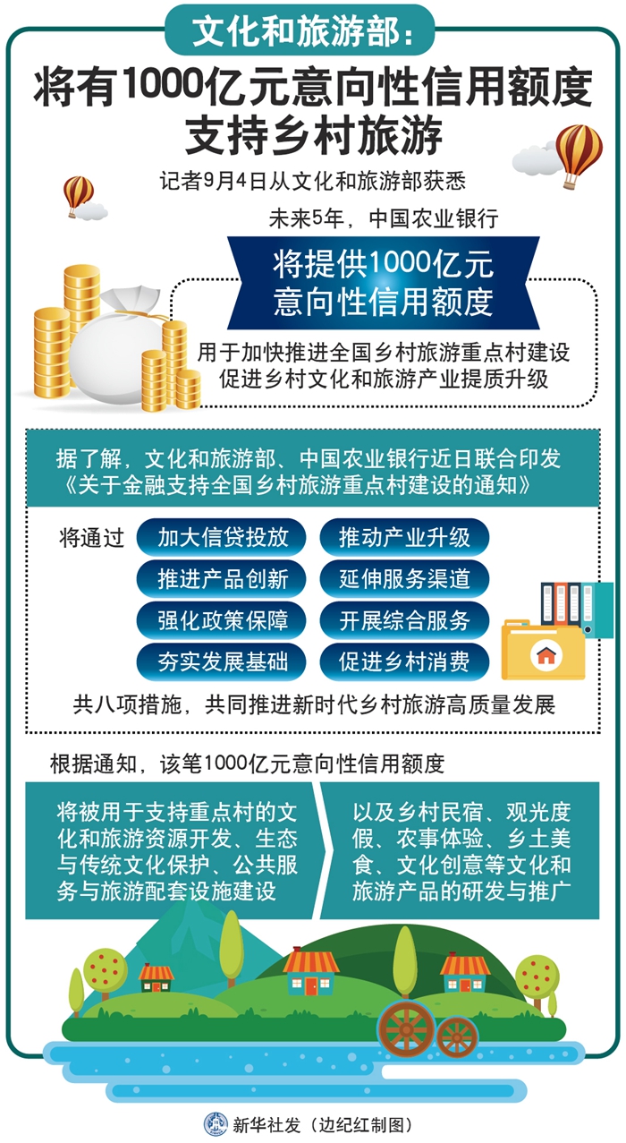 新華社北京9月4日電(記者余俊杰)記者4日從文化和旅游部獲悉,未來5年,中國農業銀行將提供1000億元意向性信用額度,用于加快推進全國鄉村旅游重點村建設,促進鄉村文化和旅游產業提質升級。