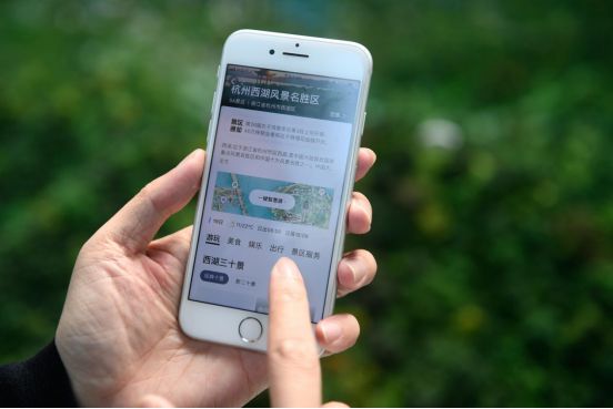 ↑2019年3月19日,游客使用手機體驗“西湖一鍵智慧游”服務,可實現一鍵導航、一鍵導覽、一鍵導游。新華社記者 黃宗治 攝