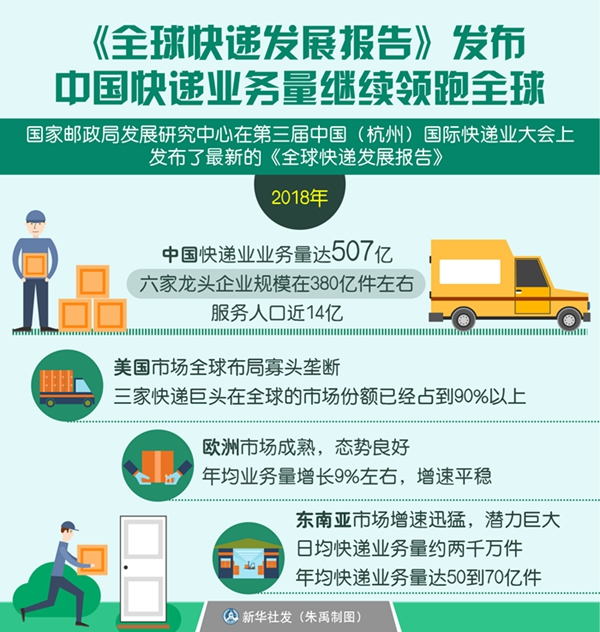 報告分析稱,中國快遞業(yè)業(yè)務量領先,市場活躍,2018年業(yè)務量達507億,六家龍頭企業(yè)規(guī)模在380億件左右,服務人口近14億;美國市場全球布局寡頭壟斷,三家快遞巨頭在全球的市場份額已經占到90%以上;歐洲市場成熟,態(tài)勢良好,年均業(yè)務量增長9%左右,增速平穩(wěn);東南亞市場增速迅猛,潛力巨大,日均快遞業(yè)務量約兩千萬件,年均快遞業(yè)務量達50到70億件。