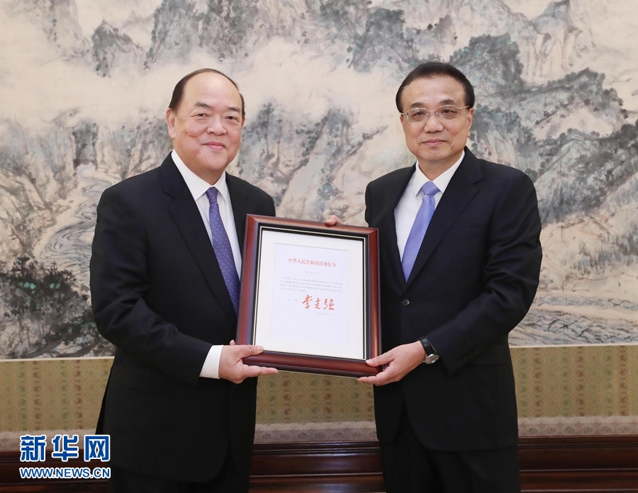 李克強會見賀一誠 頒發任命賀一誠為澳門特區第五任行政長官的國務院令