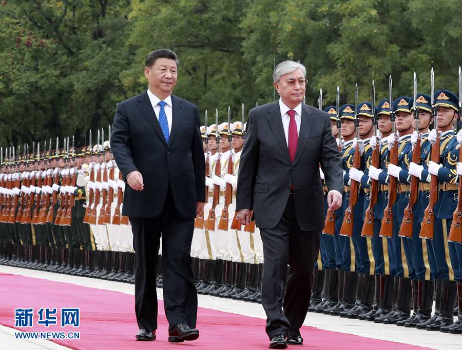 9月11日,國家主席習近平在北京人民大會堂同哈薩克斯坦總統托卡耶夫舉行會談。這是會談前,習近平在人民大會堂東門外廣場為托卡耶夫舉行歡迎儀式。 新華社記者 姚大偉 攝