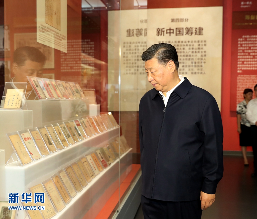 9月12日,中共中央總書記、國家主席、中央軍委主席習近平視察中共中央北京香山革命紀念地。這是習近平在香山革命紀念館參觀《為新中國奠基》主題展覽。 新華社記者 黃敬文 攝