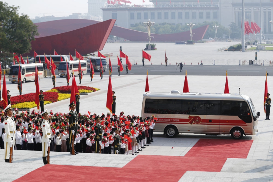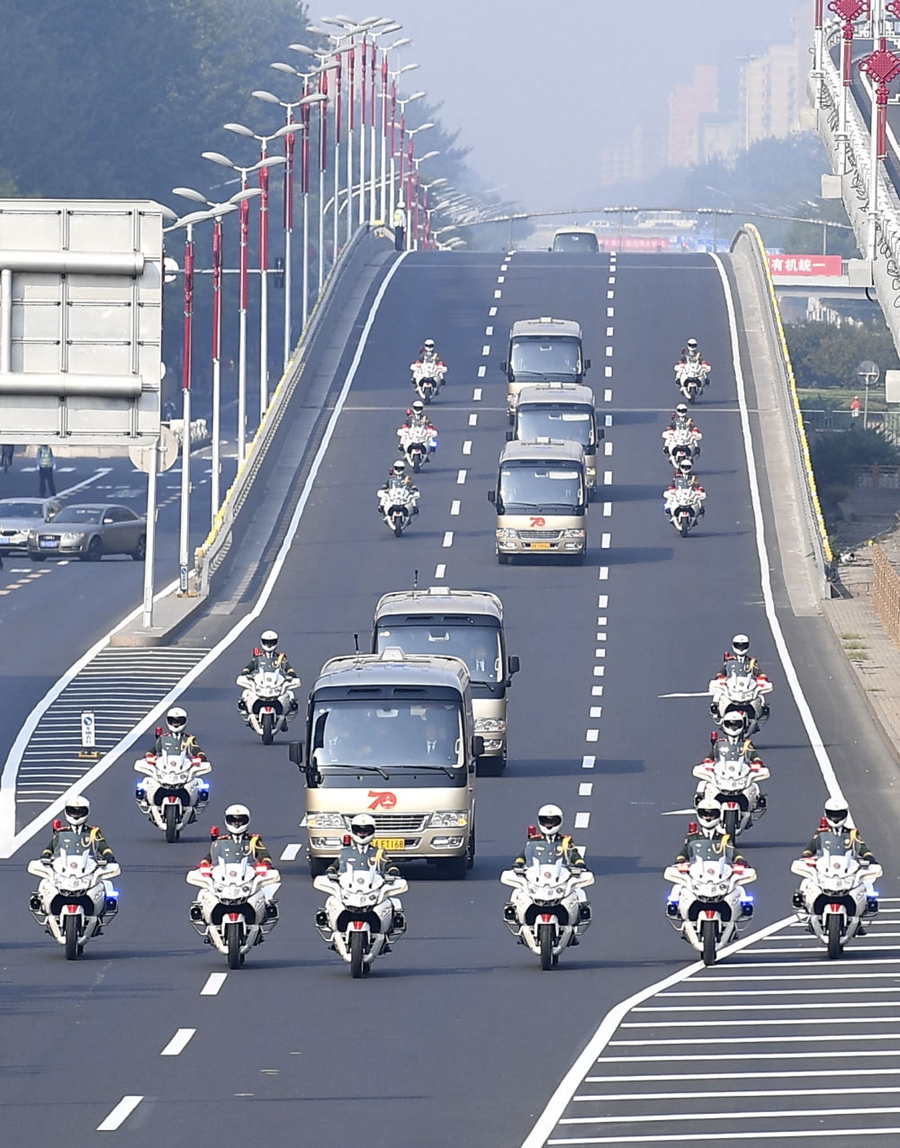 29日上午,國家勛章和國家榮譽稱號獲得者集體乘坐禮賓車從住地出發,在英姿颯爽的國賓護衛隊護衛下,匯成一列車隊,向人民大會堂進發。