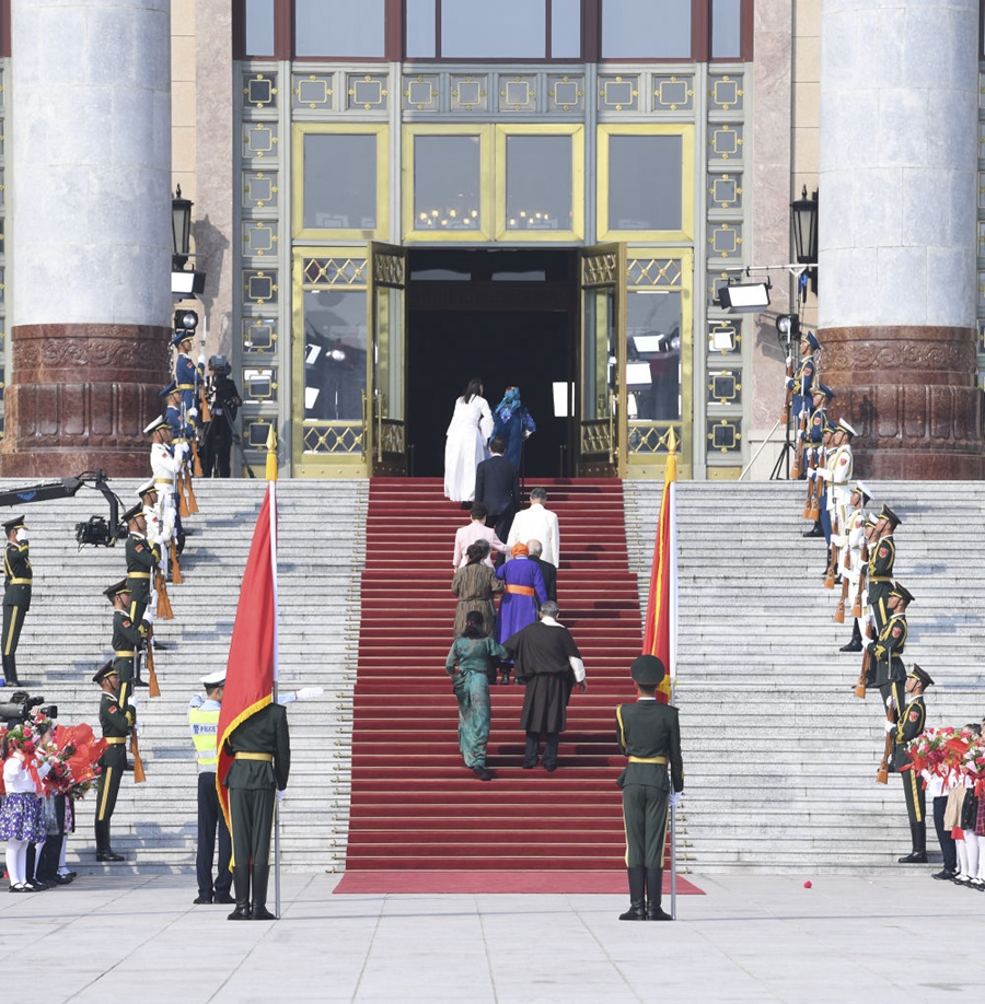 人民大會堂東門外,高擎紅旗的禮兵分列道路兩側,肩槍禮兵在臺階上莊嚴佇立。車隊抵達時,早已迎候在這里的青少年們迸發出熱情的歡呼。