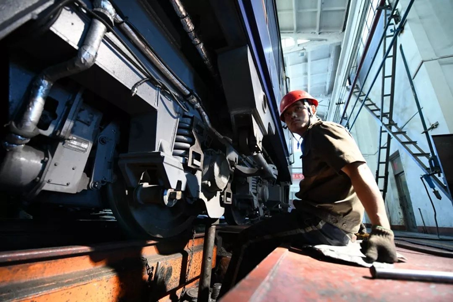 10月2日,內蒙古巴林右旗。當地鐵路職工為機車更換車輪。作者:這么近那么遠