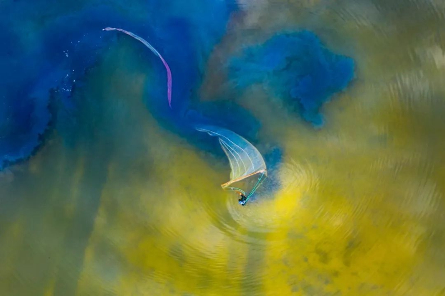 8月28日,山西運城。撈蟲人在鹽湖中撈鹽水蟲。作者:尚建周