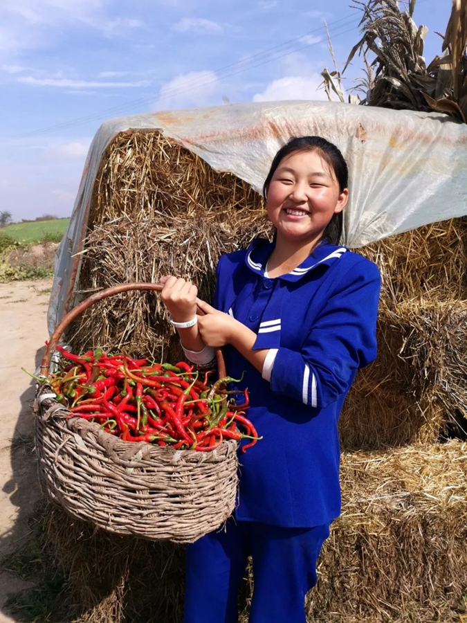 10月2日,甘肅平涼。女童提著剛采摘的辣椒,喜上眉梢。作者:花青