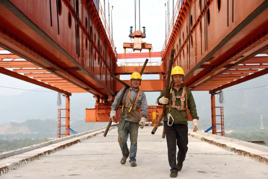 9月30日,浙江仙居。建設者們在臺金鐵路永安溪特大橋上施工。作者:王華斌