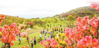 江西牙梳山風(fēng)景區(qū),大片鮮艷的杜鵑花競相綻放。影像中國