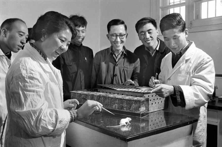 1965年9月17日,中國首次人工合成了結(jié)晶牛胰島素。圖中科學工作者正在將人工合成的產(chǎn)物注入小白鼠體內(nèi),測驗它的生物活力。新華社資料照片
