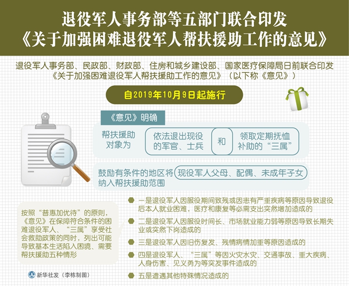新華社北京10月21日電(記者梅世雄)退役軍人事務部、民政部、財政部、住房和城鄉(xiāng)建設部、國家醫(yī)療保障局日前聯(lián)合印發(fā)《關于加強困難退役軍人幫扶援助工作的意見》(以下稱《意見》),自2019年10月9日起施行。