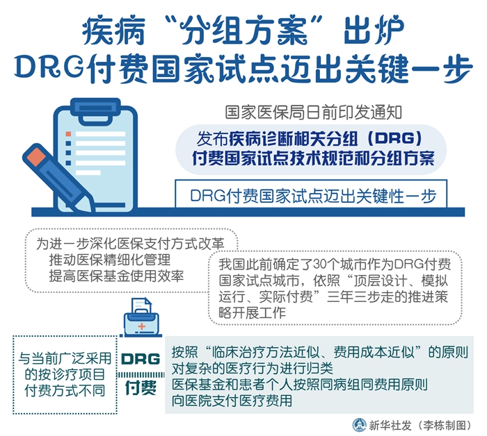 新華社北京10月24日電(記者張泉)國家醫保局日前印發通知,發布疾病診斷相關分組(DRG)付費國家試點技術規范和分組方案,DRG付費國家試點邁出關鍵性一步。