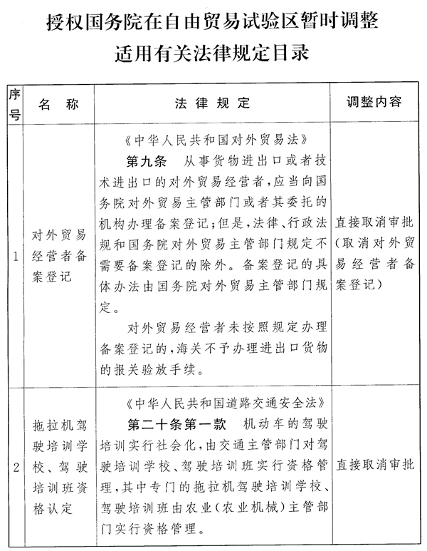 全國人民代表大會(huì)常務(wù)委員會(huì)關(guān)于授權(quán)國務(wù)院在自由貿(mào)易試驗(yàn)區(qū)暫時(shí)調(diào)整適用有關(guān)法律規(guī)定的決定