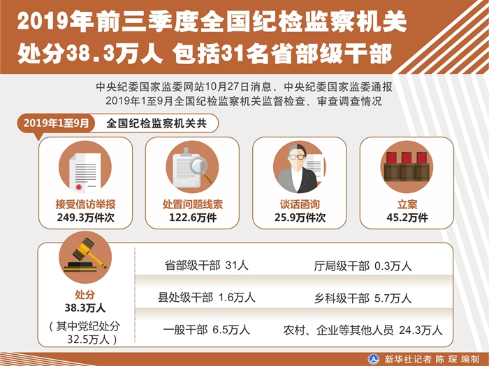 2019年前三季度全國紀檢監察機關處分38.3萬人 包括31名省部級干部-新華網