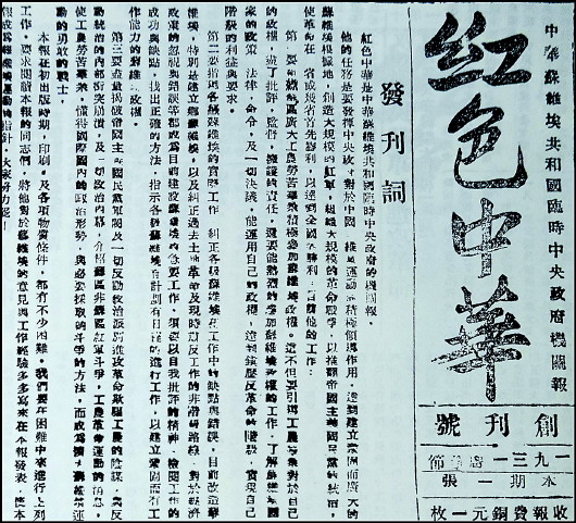 一個月后的12月11日,中華蘇維埃共和國臨時中央政府機關(guān)報《紅色中華》創(chuàng)刊。1932年2月4日起,《紅色中華》改為中國共產(chǎn)黨蘇區(qū)中央局、中國共產(chǎn)主義青年團蘇區(qū)中央局、中華蘇維埃中央政府、全總蘇區(qū)執(zhí)行局合辦的中央機關(guān)報。