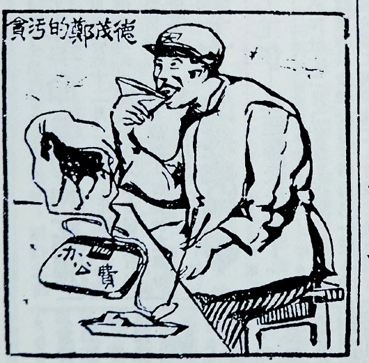 此事被揭露后,《紅色中華》在第134期發(fā)表了一幅《貪污分子鄭德茂》漫畫,畫中戴著五角星帽子用“辦公費”大吃大喝的鄭茂德,腦海里正想著一匹騾子,貪污分子的丑陋形象躍然紙上。