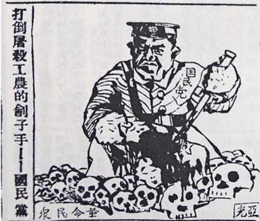 1933年7月14日,《紅色中華》第1版刊發(fā)潘漢年撰寫的社論《反對國民黨法西斯的白色恐怖》,文章配發(fā)黃亞光創(chuàng)作的漫畫《打倒屠殺工農(nóng)的劊子手——國民黨》,畫面上的國民黨兇手舉著滴血的屠刀,踏著一堆革命群眾的尸骨,將國民黨反動派與人民為敵的本性揭露無遺。