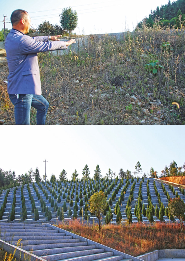 ▲拼版圖片:上圖為湖南平江縣梅仙鎮三里村支書王杏發在介紹已拆掉的活人墓;下圖為三里村新建公墓(11月15日攝)。新華每日電訊記者 謝銳佳 攝