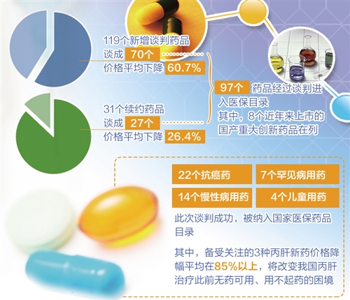 記者了解到,22個抗癌藥、7個罕見病用藥、14個慢性病用藥、4個兒童用藥此次談判成功,被納入國家醫(yī)保藥品目錄。其中,備受關(guān)注的3種丙肝新藥價格降幅平均在85%以上,將改變我國丙肝治療此前無藥可用、用不起藥的困境。