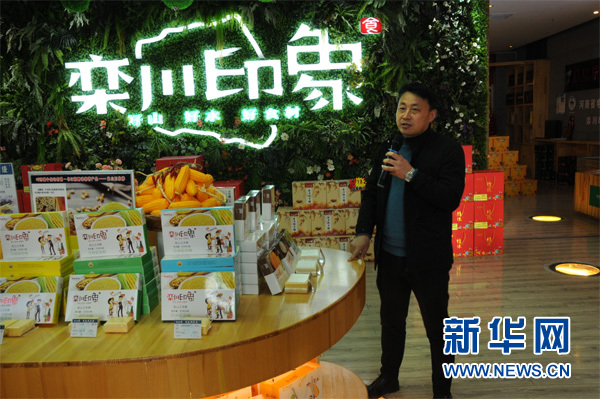 欒川縣農(nóng)業(yè)農(nóng)村局局長黃正煊為記者介紹“欒川印象”品牌發(fā)展及助農(nóng)情況。新華網(wǎng) 張朝華攝