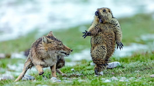 鮑永清的獲獎作品《生死對決》,展現(xiàn)的是一只藏狐捕獵旱獺的畫面:藏狐呲出的獠牙和旱獺手足無措的樣子,極富表現(xiàn)力,讓這個完美的瞬間充滿動感。人們仿佛聽見藏狐喉底顫出的低吟和旱獺的驚聲尖叫。無數(shù)被打動的人心,自會臆想出種種結(jié)局。