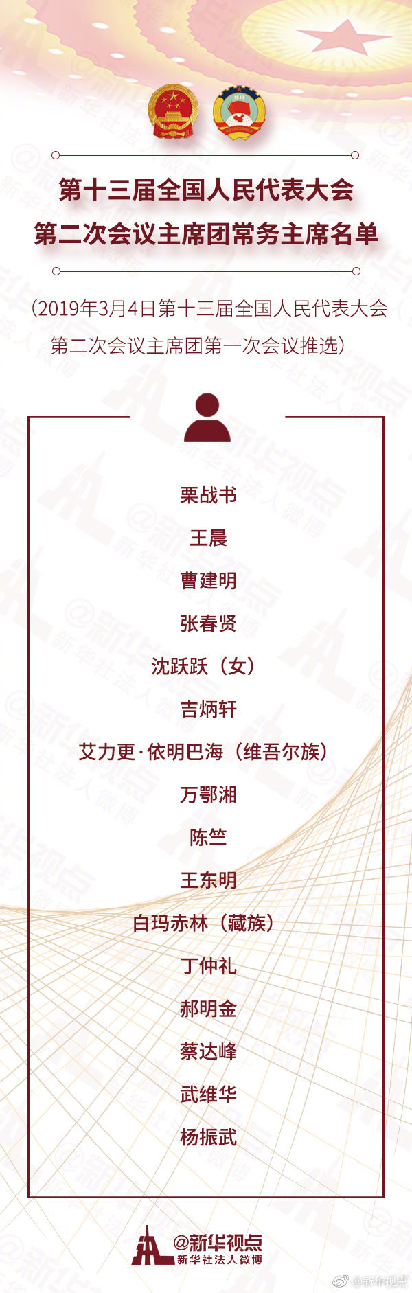 栗戰(zhàn)書 王晨 曹建明 張春賢 沈躍躍(女) 吉炳軒 艾力更·依明巴海(維吾爾族) 萬(wàn)鄂湘 陳竺 王東明 白瑪赤林(藏族) 丁仲禮 郝明金 蔡達(dá)峰 武維華 楊振武