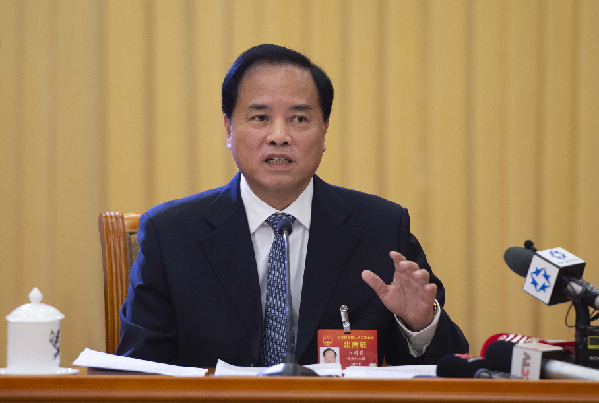 3月5日,海南代表團(tuán)在住地召開(kāi)全體會(huì)議,審議政府工作報(bào)告。圖為劉賜貴代表審議時(shí)發(fā)言。新華網(wǎng)發(fā)(王凱 攝)