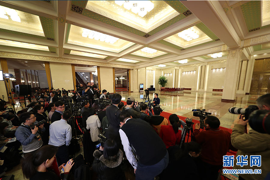 3月8日,2019年全國兩會第三場“部長通道”在人民大會堂舉行。部長們在這里直面熱點,回應關切。這是記者在“部長通道”采訪。新華網/中國政府網 陳杰 攝