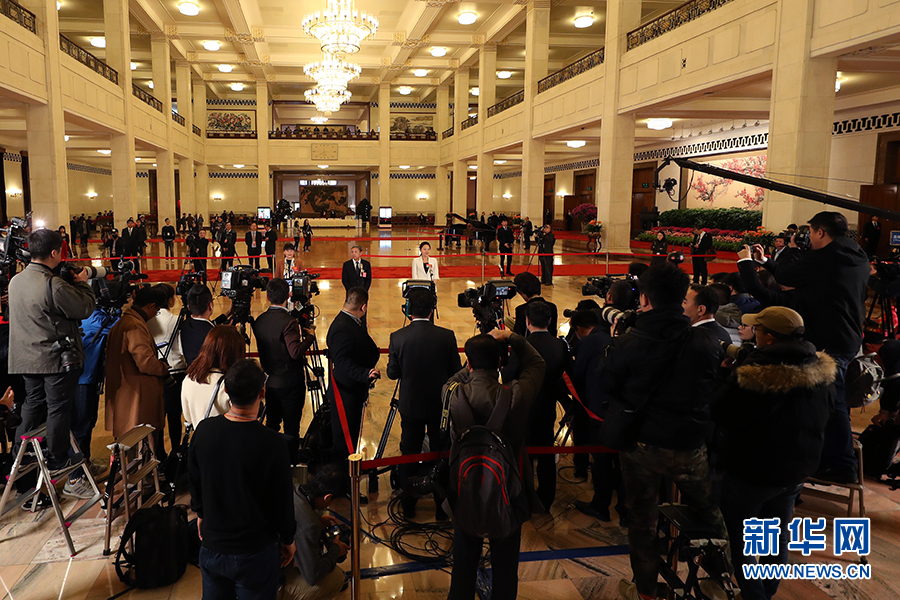 3月15日,十三屆全國人大二次會議在北京人民大會堂舉行閉幕會。圖為全國人大代表在“代表通道”接受采訪。新華網(wǎng)/中國政府網(wǎng) 陳杰 攝
