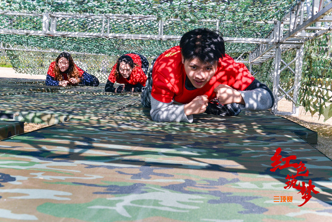 上午九時,一支隊伍正合力將長繩和70面國旗串聯(lián)懸掛至旗海中,讓人聯(lián)想起第一面五星紅旗在開國大典廣場上飄揚(yáng)的場景;另一支隊伍的幾位隊員正用PVC管作為連接,合力吹氣將5個氫氣球吹爆,這是在通過游戲的形式致敬1967年的第一顆氫彈爆炸成功;還有一群隊員穿著救生衣、膠鞋扛著自己的隊友穿越洪水區(qū)、獨木橋區(qū)、沼澤地區(qū),還原98 年抗洪搶險、5.12抗震救災(zāi)的場景……
