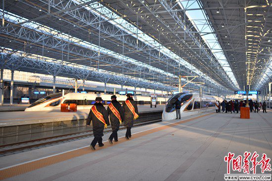 12月30日,北京至張家口高速鐵路開通運營,京張高鐵設計時速350公里,全線設北京北、清河、沙河(不辦理客運)、昌平、八達嶺長城、東花園北、懷來、下花園北、宣化北、張家口10座車站。京張高鐵是我國首條智能化高速鐵路,也是2022年冬奧會的“門戶工程”。北京北站站臺,三名站務人員走向一輛即將發車的京張高鐵列車。 實習生 宋欣然/攝