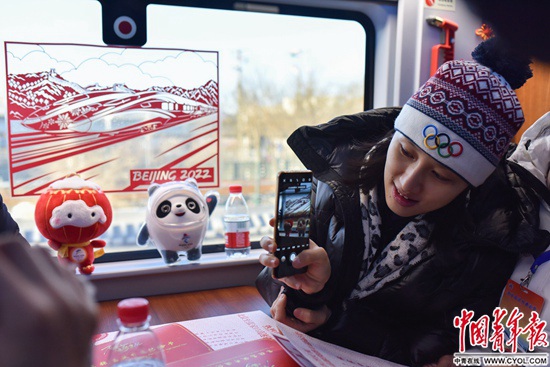 一名乘客正在拍攝2022年北京冬奧會吉祥物和車窗上的窗花。這些剪紙窗花是由張家口蔚縣剪紙藝人創作,包含了詹天佑畫像、京張高鐵和冰雪運動等元素。實習生 宋欣然/攝
